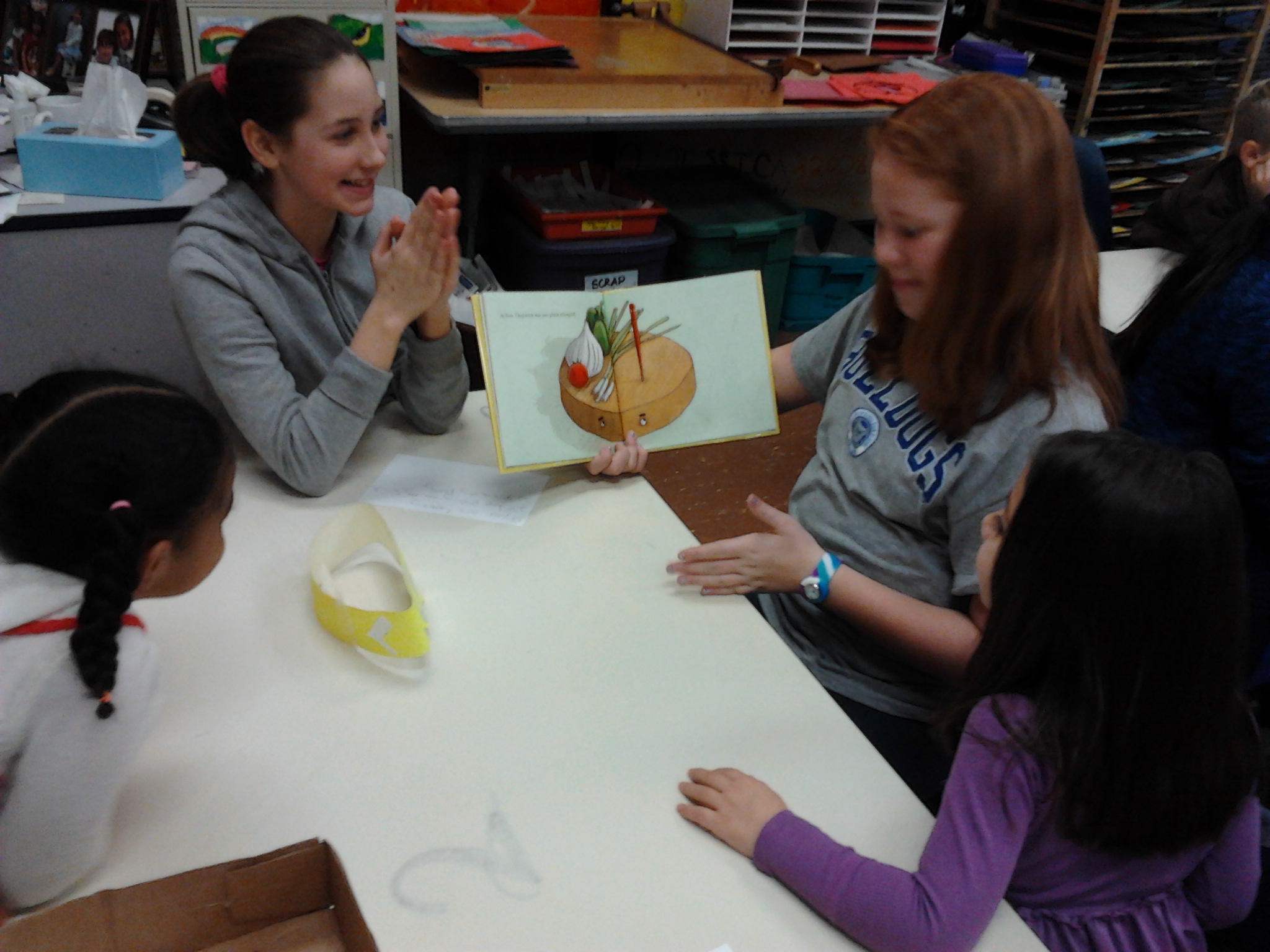 Sixth grade students and kindergarten buddies reading and planning fabric messages of peace.