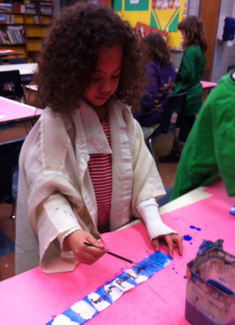Mrs. Guest’s first grade students really put in their best effort dyeing and painting messages of peace on Tuesday. The results were stunning, and we had a fantastic time! Mrs. Slattery shared this reflection about how the class went: