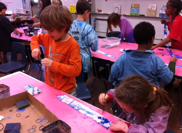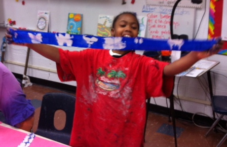 During the final Project Peace session with first grade students, we made it our goal to brighten as many messages of peace as possible with different shades of blue.The students used sky blue, cobalt, turquoise, and indigo, and lovely mixed blues of every shade! By the end of class, our group effort resulted in over fifty painted fabric strips. Our hands were left a little blue, but we were in great spirits. What a fun experience! The results are stunning, and we can’t wait to see the messages of peace as a beautiful and inspiring fabric border for the final school-wide artwork