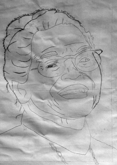 Just as President Obama dedicated a statue of Rosa Parks to be placed in the Capital’s National Statuary Hall Collection, fifth grade students at Mills Lawn started a large scale contour drawing of Rosa Parks as one of the three large canvases that will be the centerpieces for Project Peace. Excellent timing honoring Rosa Parks as one of the Hero/Peacemakers for our school-wide project! President Obama reflected that Rosa Parks was, “slight in stature, but mighty in courage” and who lived a life of “dignity and grace”. We’ll be able to read more about Rosa Parks directly from the portrait that students are creating as layers of text, biographical information and quotations, are placed on top of the line drawing.