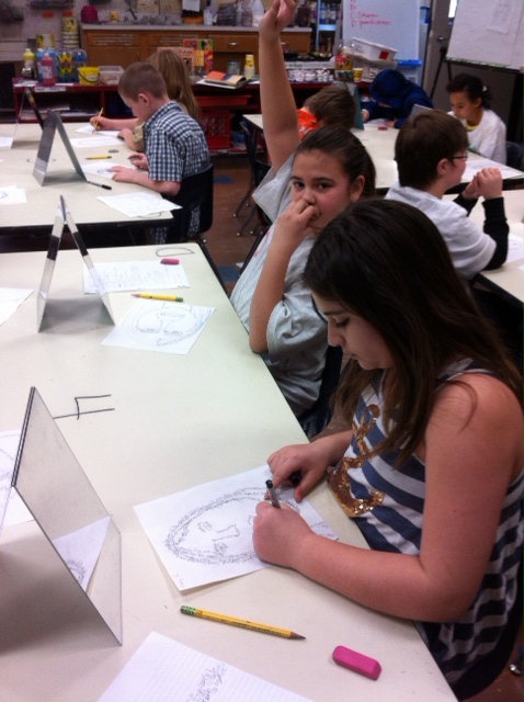 Fourth grade students came to their second session of Project Peace with research on hero/peacemakers Gandhi, Martin Luther King, Jr., and Rosa Parks. Students voted as a class to start sketching on canvas the projected image of Gandhi. The other fourth and fifth grade classes will begin sketching Martin Luther King, Jr. and Rosa Parks. Once the line drawing of Gandhi was finished, students could begin layering text including biographical information and quotations by Gandhi himself. Gandhi said, “We must be the change we wish to see in the world” and “My life is my message”. His life was dedicated to a non-violent approach to working for social equality and political independence for India.