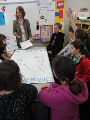 One last after school session with sixth grade students and the help of additional community artist volunteers resulted in a great amount of progress toward the finished hero/peacemaker portraits. Thanks everyone! Mrs. Paul… Continue reading →