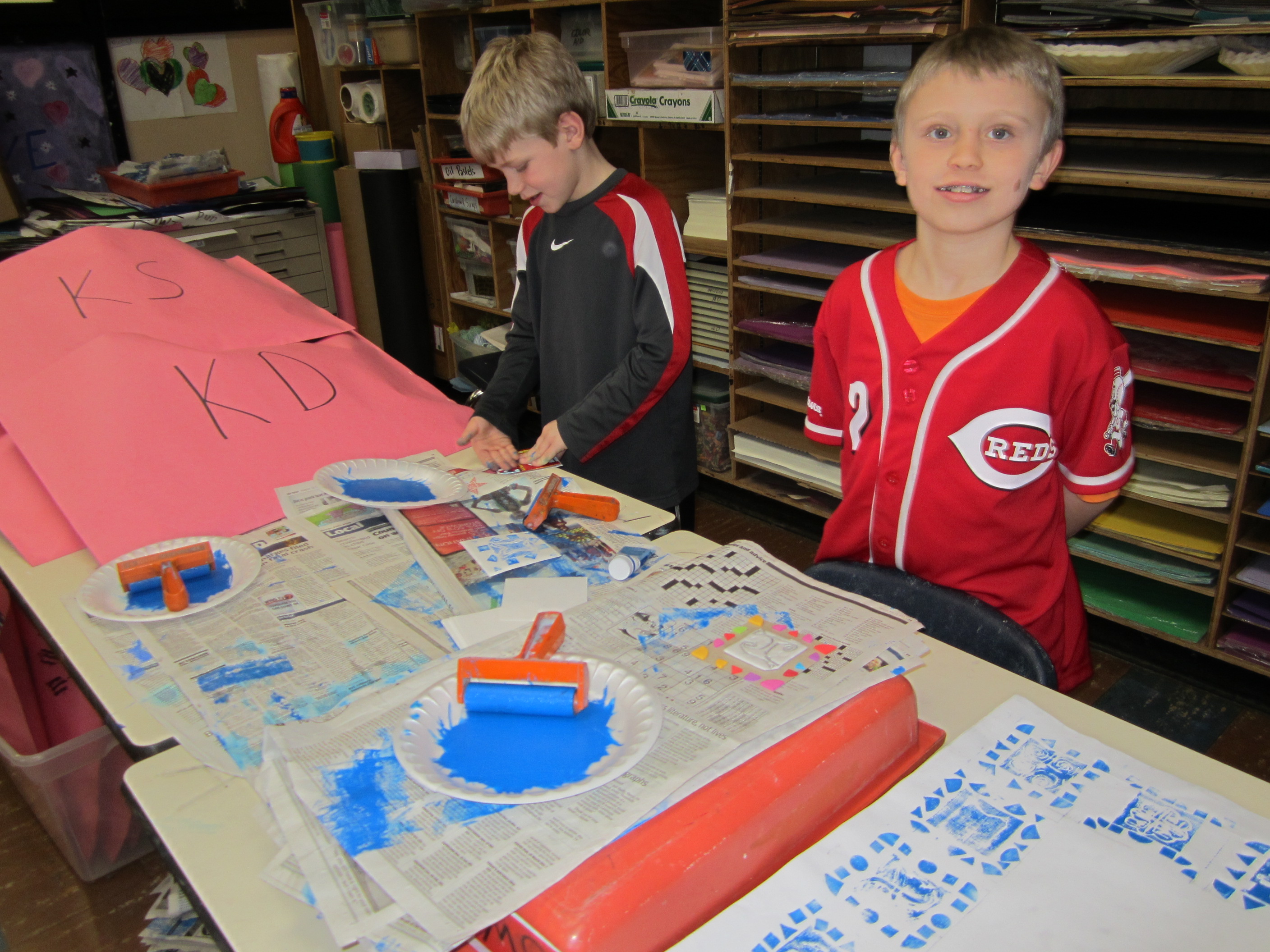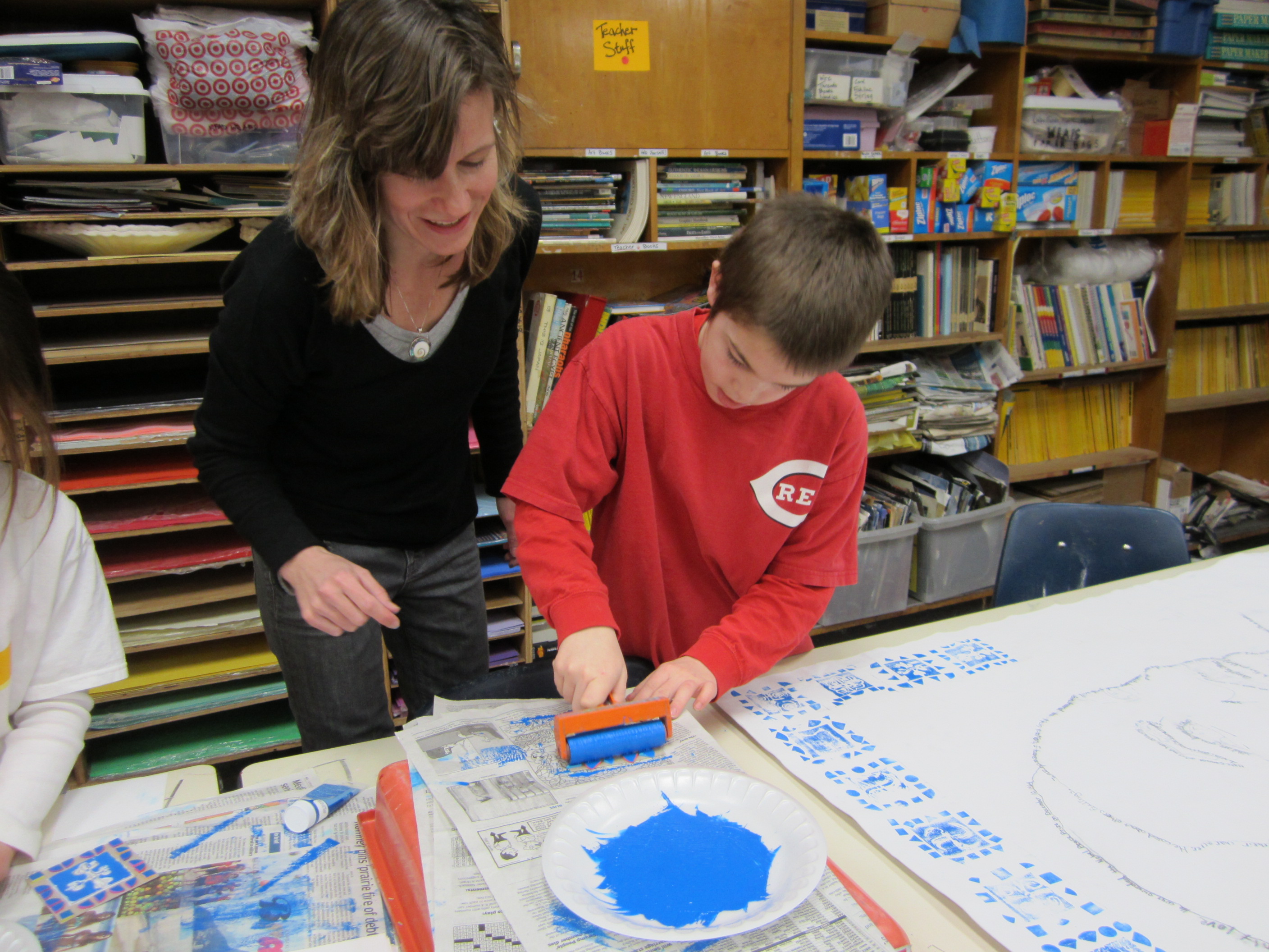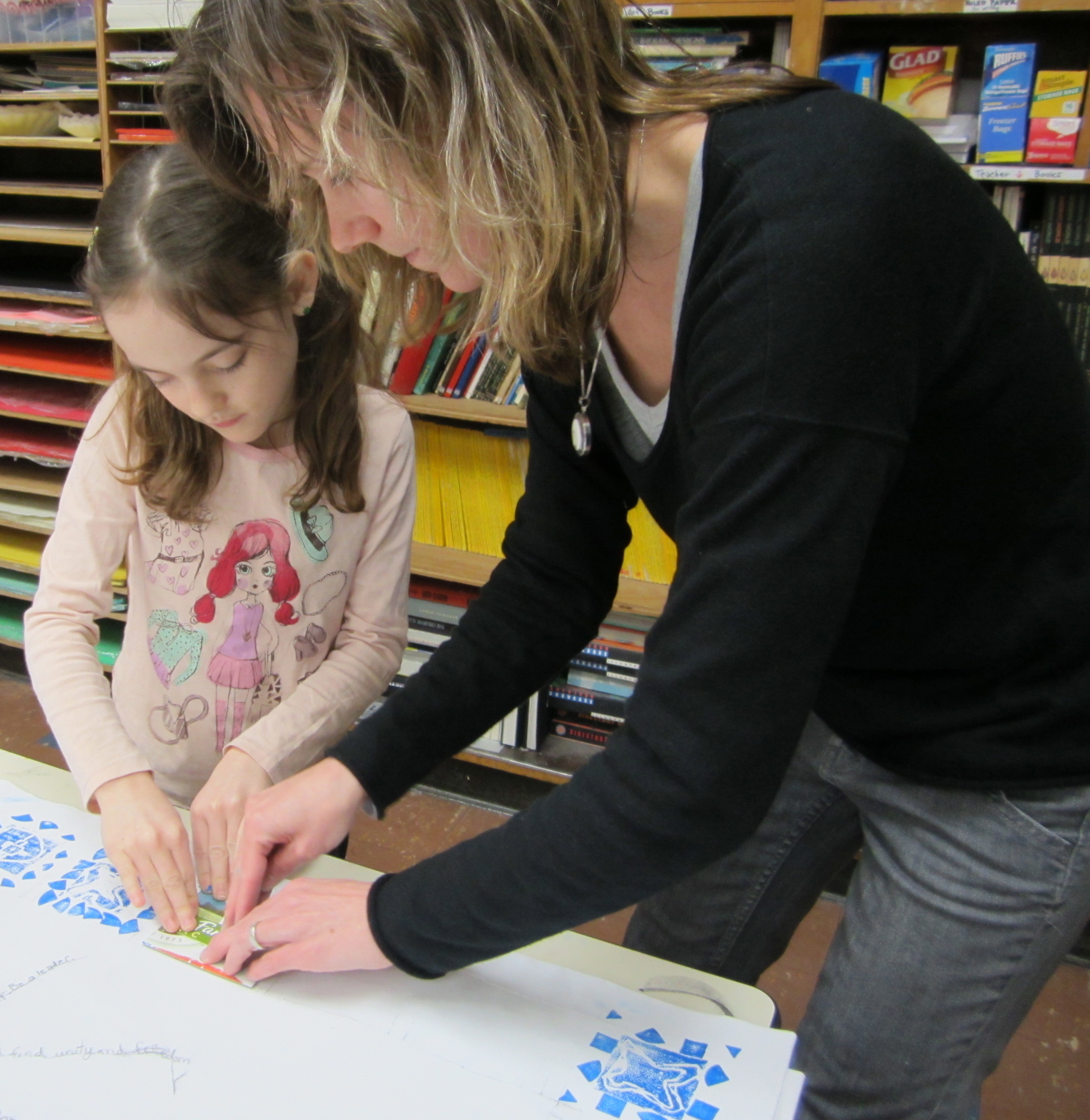 Second and third graders continue by stamping and printing their symbols to create a beautiful blue border on the hero/peacemaker canvases. Have you started to notice lots of blue in the artwork that students are making? Conveniently representing our school colors, blue fabric messages of peace and now blue peacemaker symbols will strongly build on our monochromatic color scheme.
