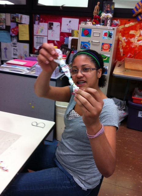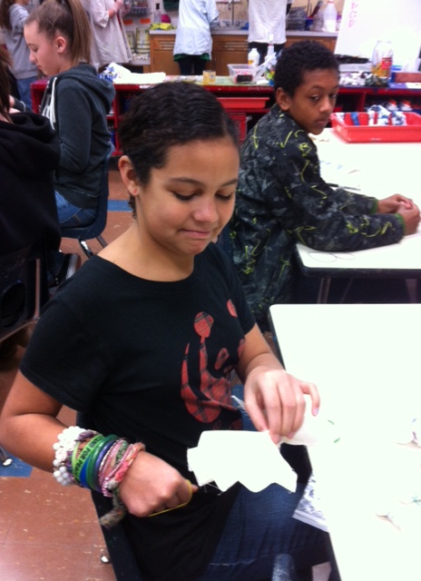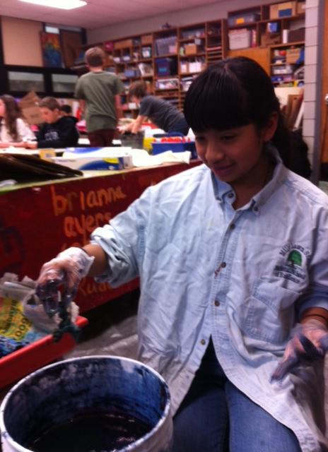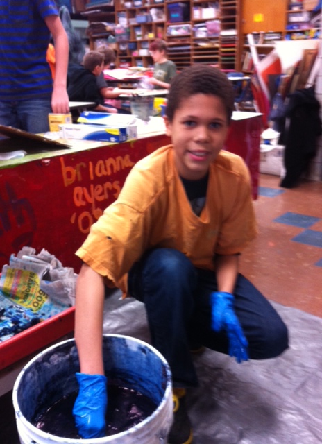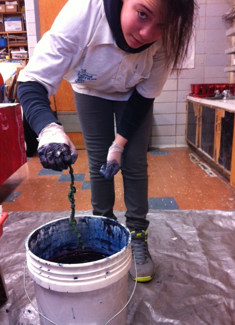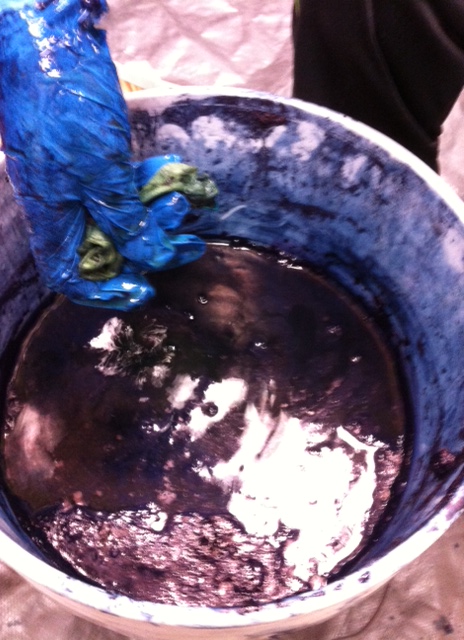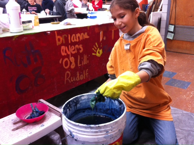 Sixth grade students have been extending their experience of creating fabric messages of peace with kindergarten students to writing more complex statements and goals for being peacemakers. These fabric strips along with larger pieces of fabric are being folded, twisted, and bound to create different patterns and designs when dyed in the indigo. Students viewed images and videos describing the process of indigo dyeing as well as indigo dyed fabric examples from around the world including the work of contemporary artists who are still creating art with the indigo dyeing process today. Check out the video below of Japanese Shibori Indigo! We’re just getting started with the dyeing process, which includes dipping our fabric into the dye vat and slowly pulling out a sample that looks green. Only when the dye interacts with the oxygen in the air will it start to turn blue. This process of oxidizing can take just a minute or up to an hour.