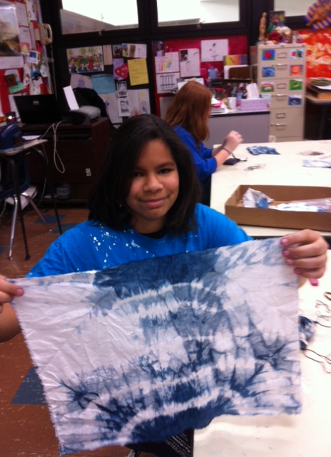 Check out these stunning results from sixth graders’ folding, binding, and knotting fabric and dyeing in our indigo vat! These lovely fabric pieces will be cut into strips and added to the fabric messages of peace to create an outer border for the finished artwork for Project Peace. Art sessions with students are wrapping up and Mrs. Paul and Mrs. Housh will be working with a few sixth grade students to make the final design decisions and complete the three hero/peacemaker panels. Get ready for the unveiling of the final artwork next week!