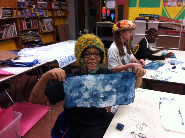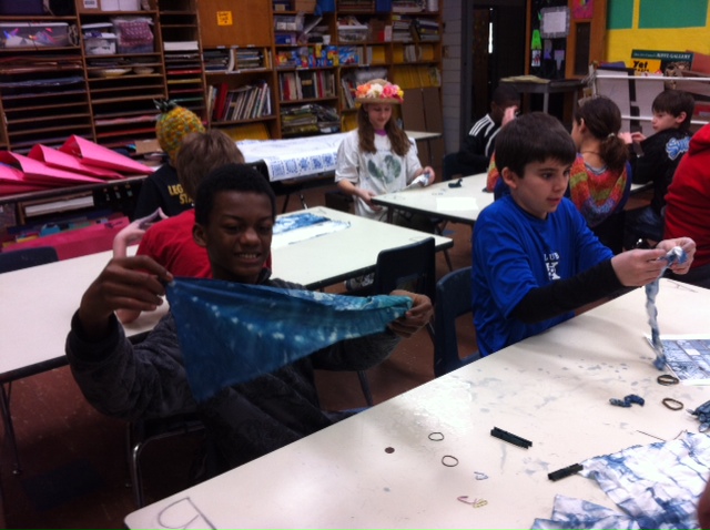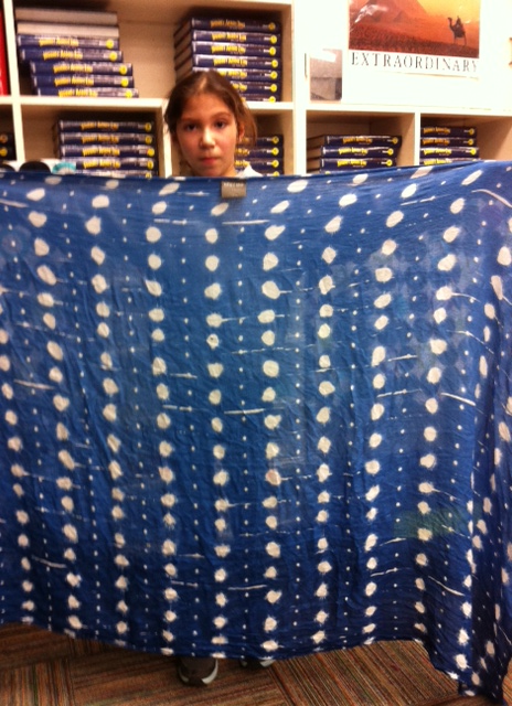 Check out this beautiful example of an indigo dyed textile brought in to share by one of our sixth graders! This large cloth looks very similar to some of the Japanese Shibori examples we looked before dyeing our own fabric. The final session of indigo dyeing resulted in some lovely samples. These pieces of fabric will be cut into strips and added to the border of the hero/peacemaker artwork. Are you getting excited to see the assembled hero/peacemaker artwork? Check out the next couple of posts to see students helping out as designers and adding the finishing touches!
