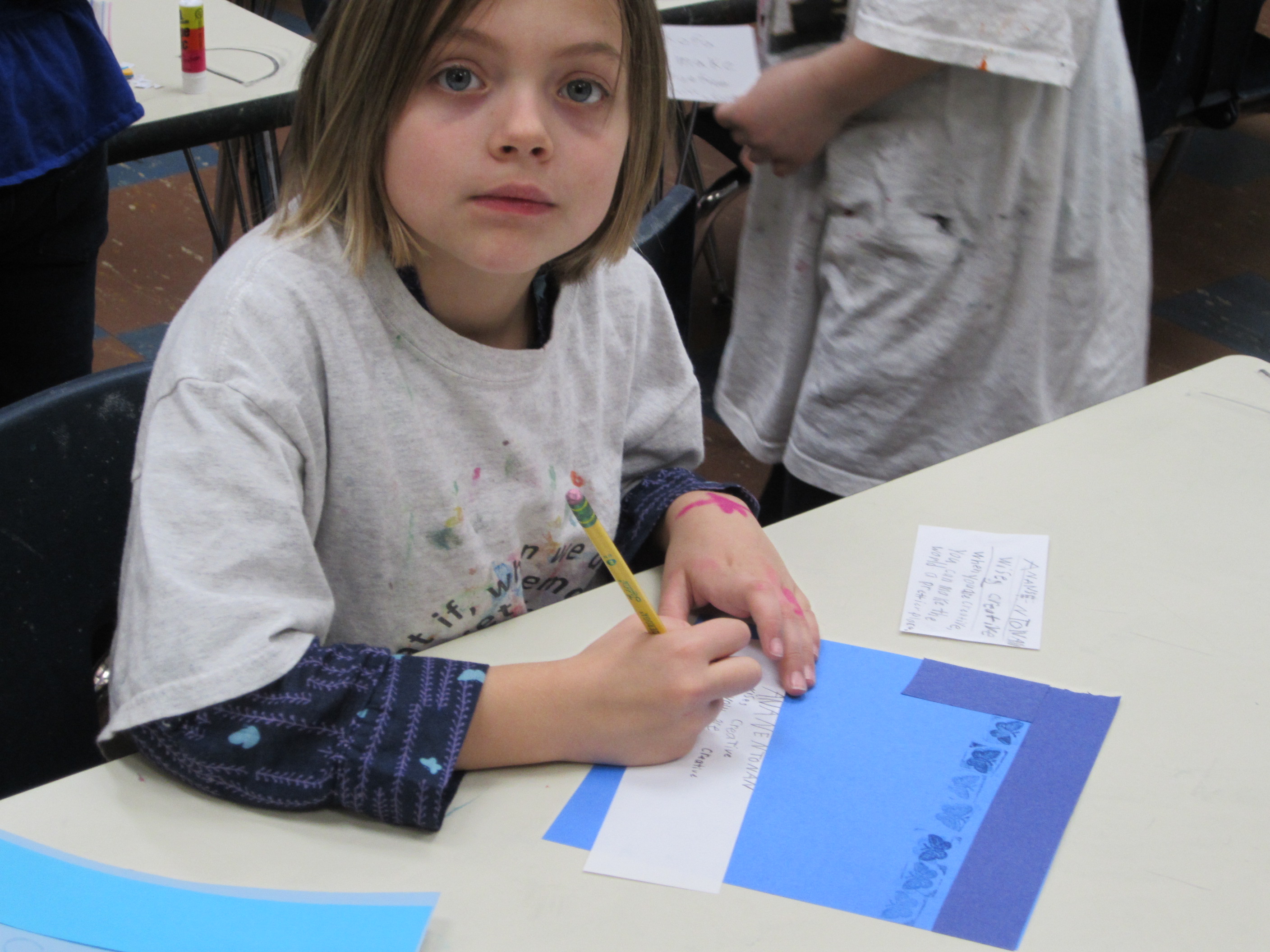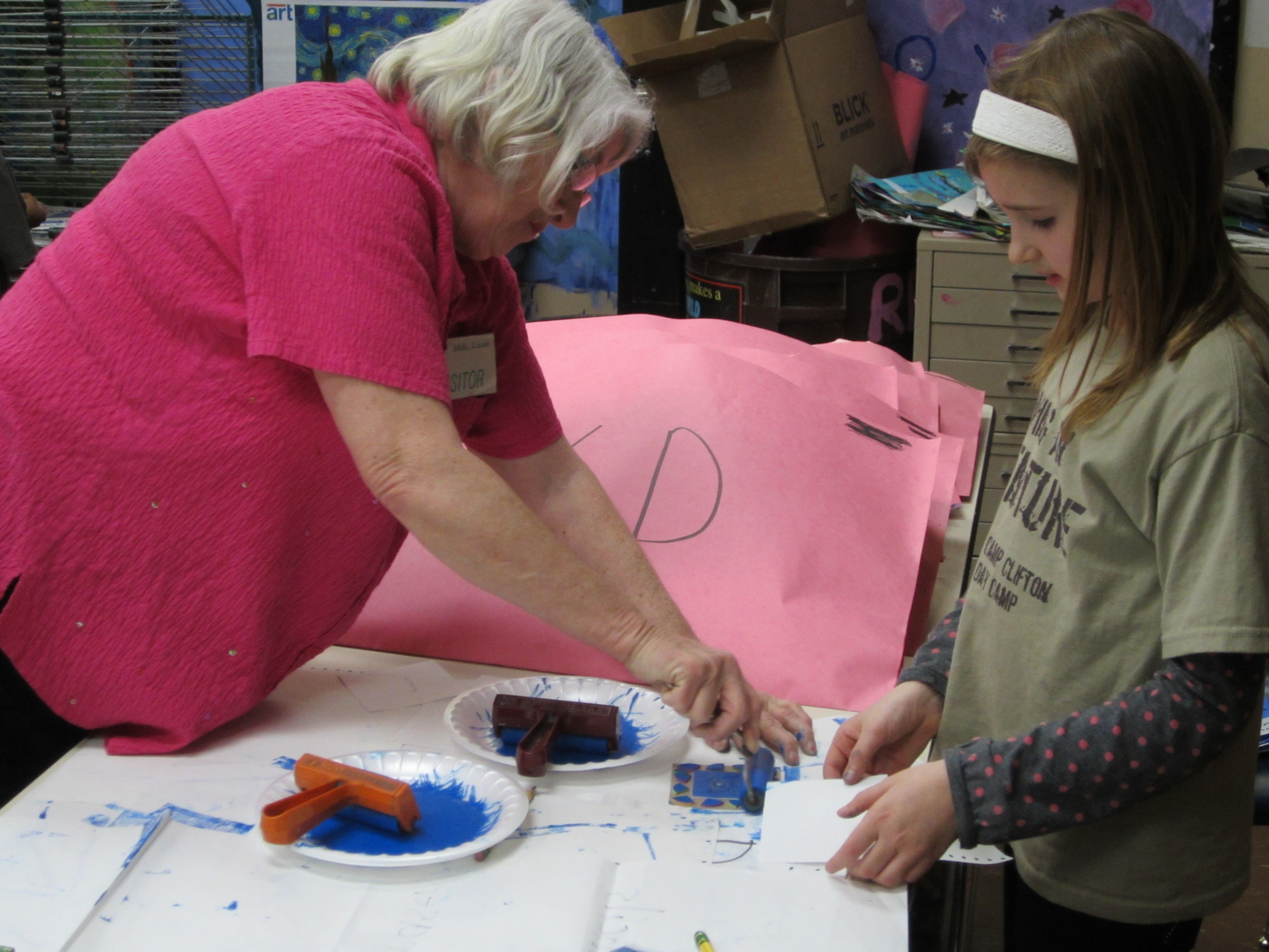 Second and third grade students not only stamped their peacemaker symbols on the canvases that make up the hero/peacemaker artwork for Project Peace, but students created their own print to take home as well. The printed symbols, inspired by African Adinkra symbols, represent love, loyalty, friendship, reflection, dedication, integrity, and many other attributes of a peacemaker. The individual artwork will serve as a reminder for students to make the choice each day to act like a peacemaker in their community.