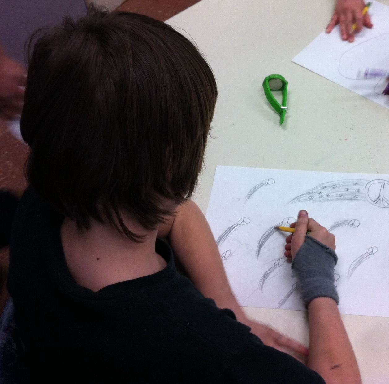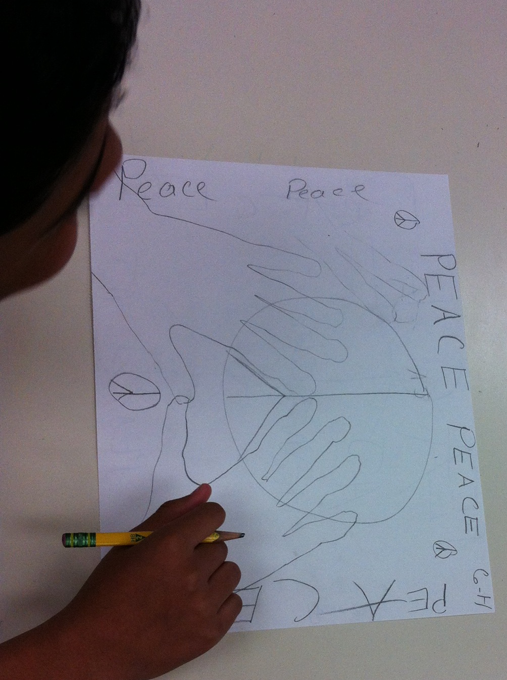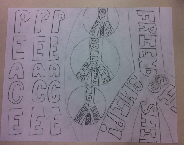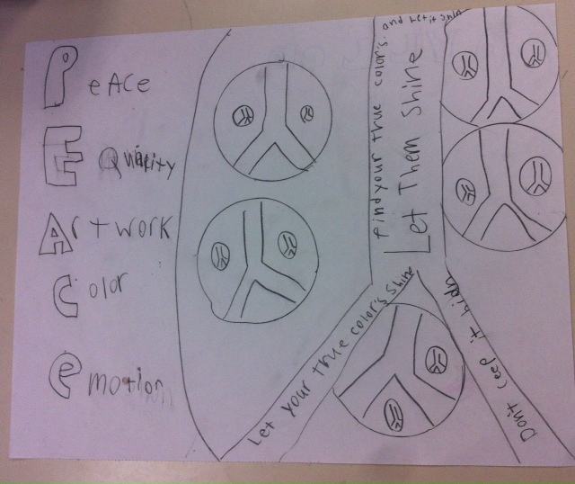 Sixth grade students participated in a brainstorming session in Art today with guest artist Mrs. Tallman in order to start to develop ideas for a Peace Mural on the Kickball Wall. Students shared their response to the question, “What does peace look like at Mills Lawn?” as part of the brainstorming process. Some of their responses included: Cooperation; Respect; Getting along; Calm; Relating to others; and friendship.