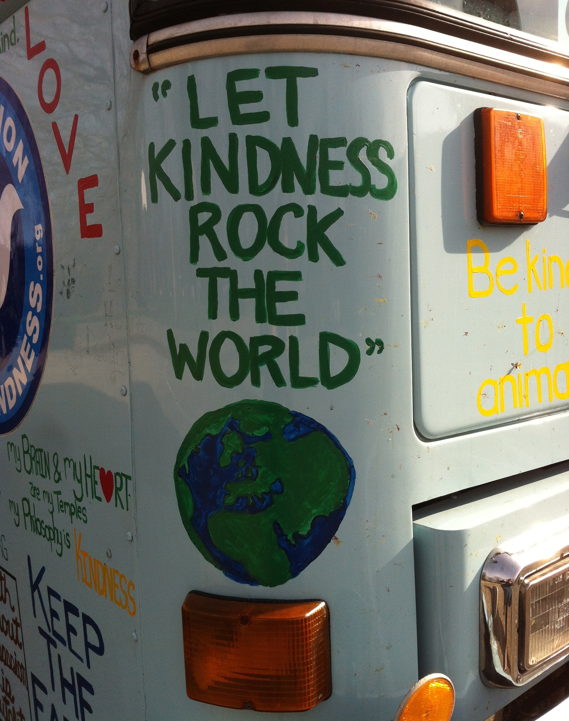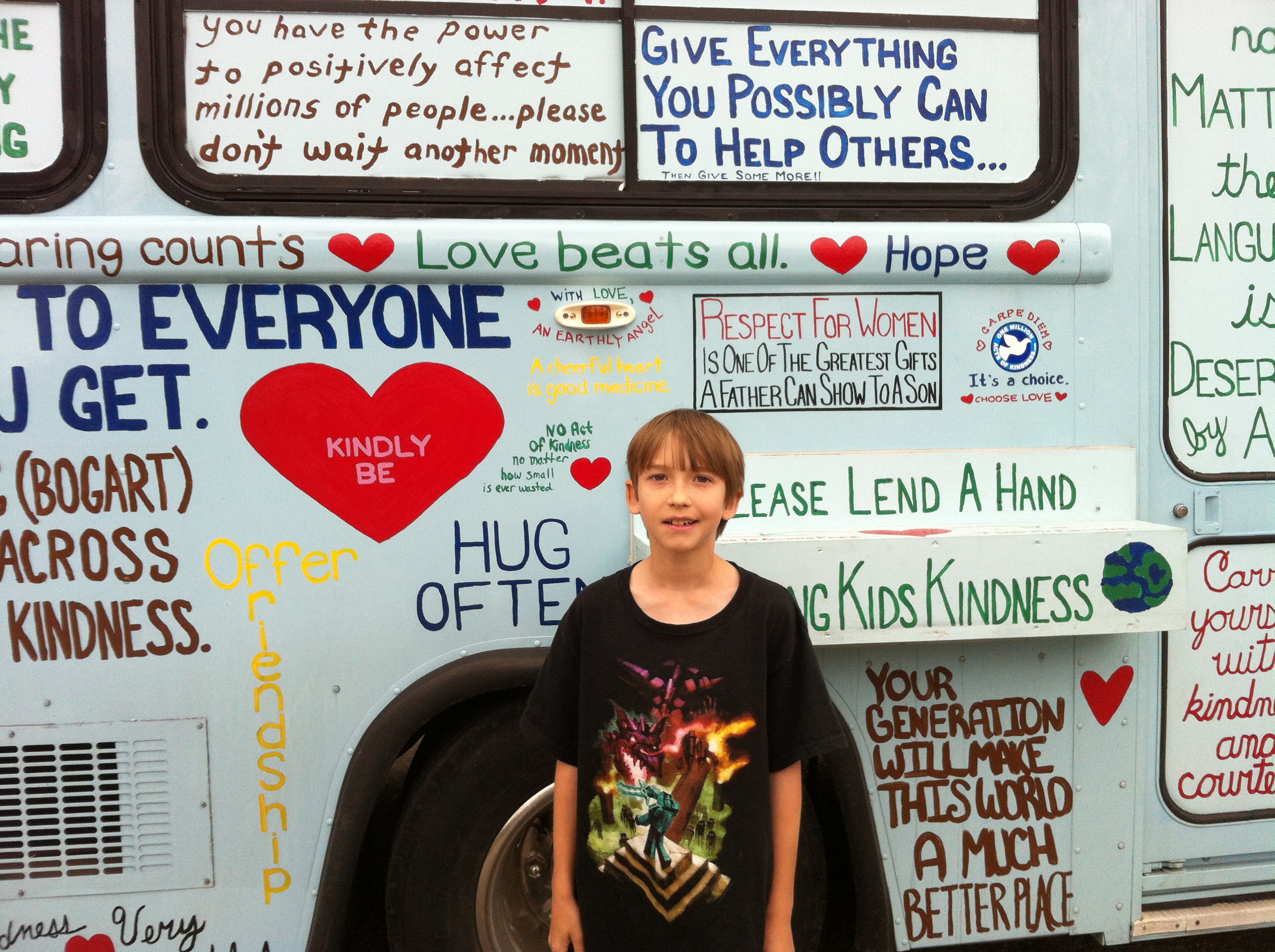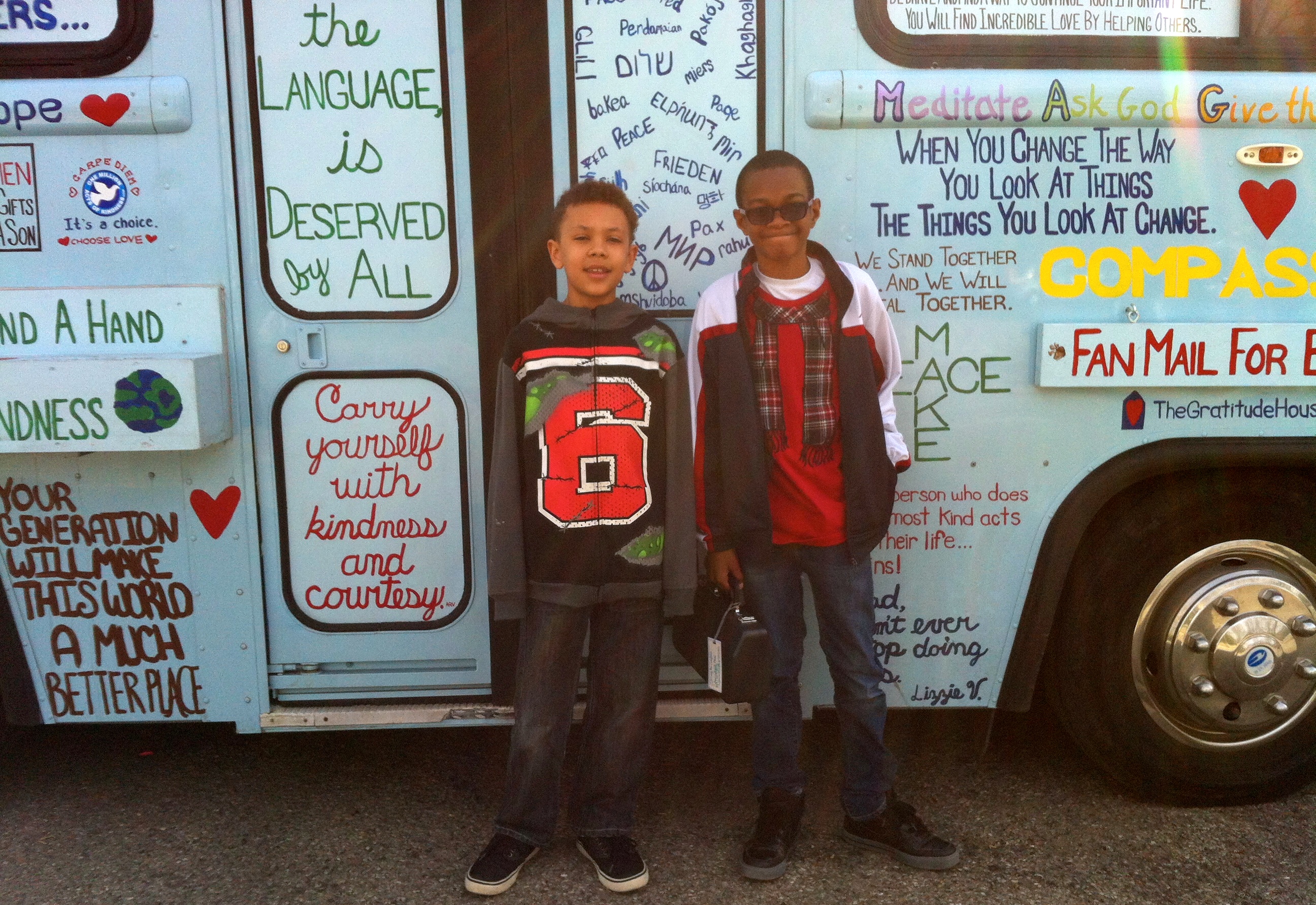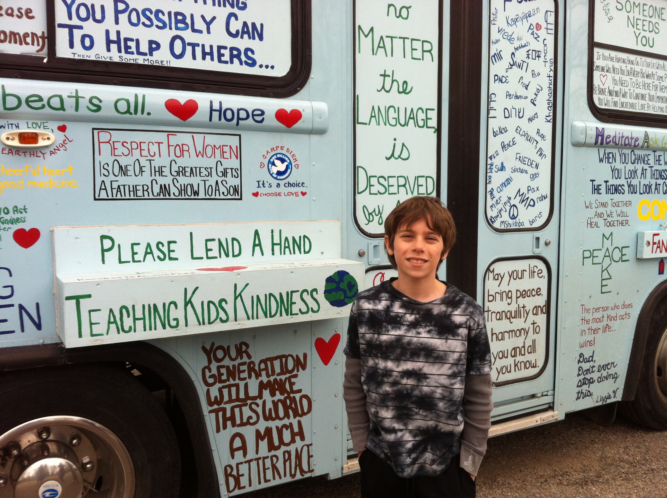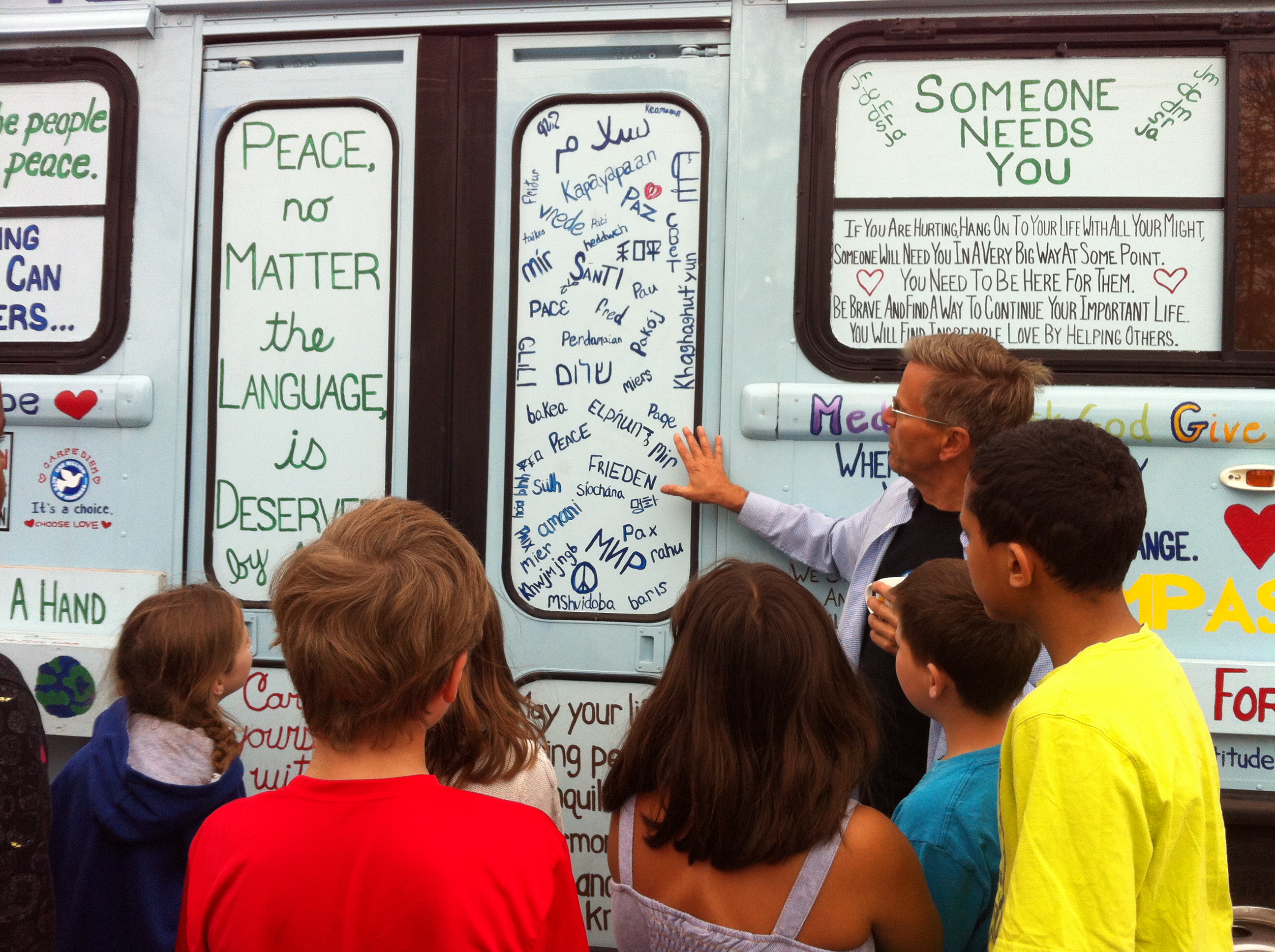 The “Kindness Bus” came to Yellow Springs last week, and Mills Lawn students as well as students at the middle and high school had the opportunity to get a personal tour with Bob Votruba and Bogart the dog! Bob explained that he sold his house and got rid of nearly all his possessions and now travels around on his bus talking to people about peace because he believes in the importance of spreading kindness around the world. His goal is to encourage others to perform acts of kindness as he spreads the message of his “one million acts of kindness” campaign. His beautiful bus is painted with messages of peace and loving kindness. Some of the messages honor the experiences of students and individuals struggling to be peacemakers and upstanders in their community, and all the messages encourage love and kindness as a tool for healthier, happier, more peaceful world.