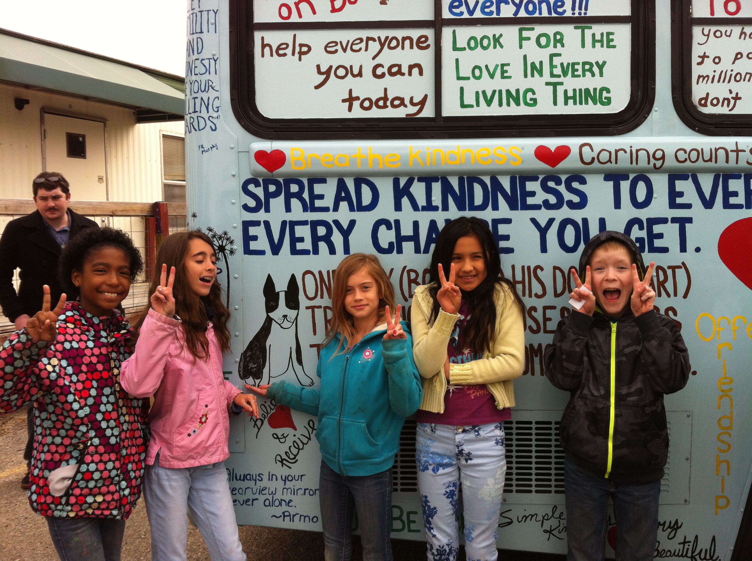 As students and teachers alike walked around the bus, we saw peace written in over forty languages, messages of compassion, gratitude, peace, and love including: “Spread kindness to everyone… every chance you get”; “Let kindness rock the world”; “Offer friendship”; and “Peace, no matter the language, is deserved by all”. Bob asked teachers if they could see themselves driving such a special bus promoting peace, and many of the teachers responded that they could. Mr. Trumbull shared the comment that we all in our own small way drive the kindness bus each day when we choose to act with kindness and compassion towards others. Each and every person who performs a small act of kindness contributes to the millions of acts of kindness that have the power to make the world a better place. Keep up the good work Mills Lawn! Let’s reach the goal of One Million Acts of Kindness in our community! And don’t forget to write Bogart and tell him all about the kind acts that you’ve been up to! Visit the One Million Acts of Kindness website: http://www.onemillionactsofkindness.com