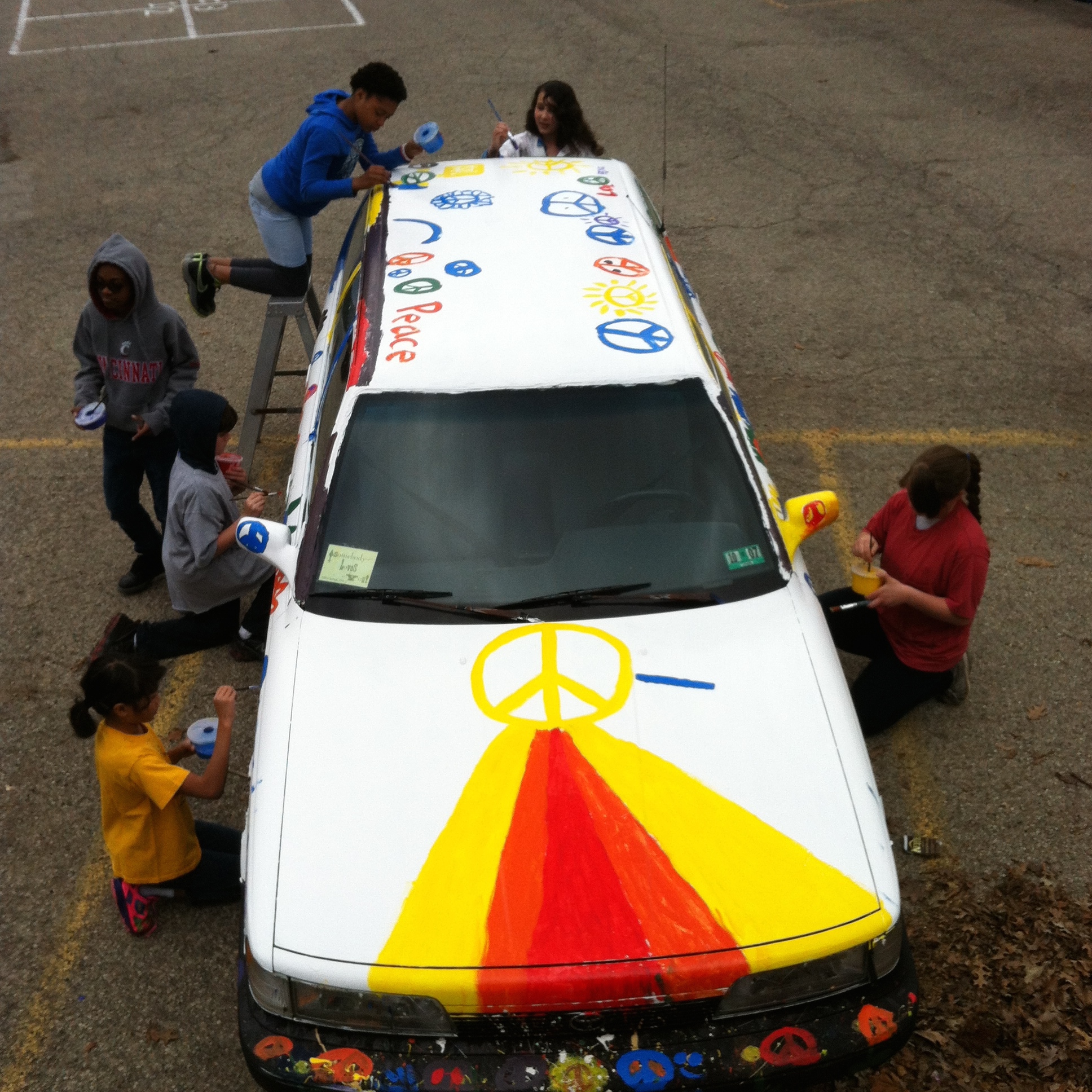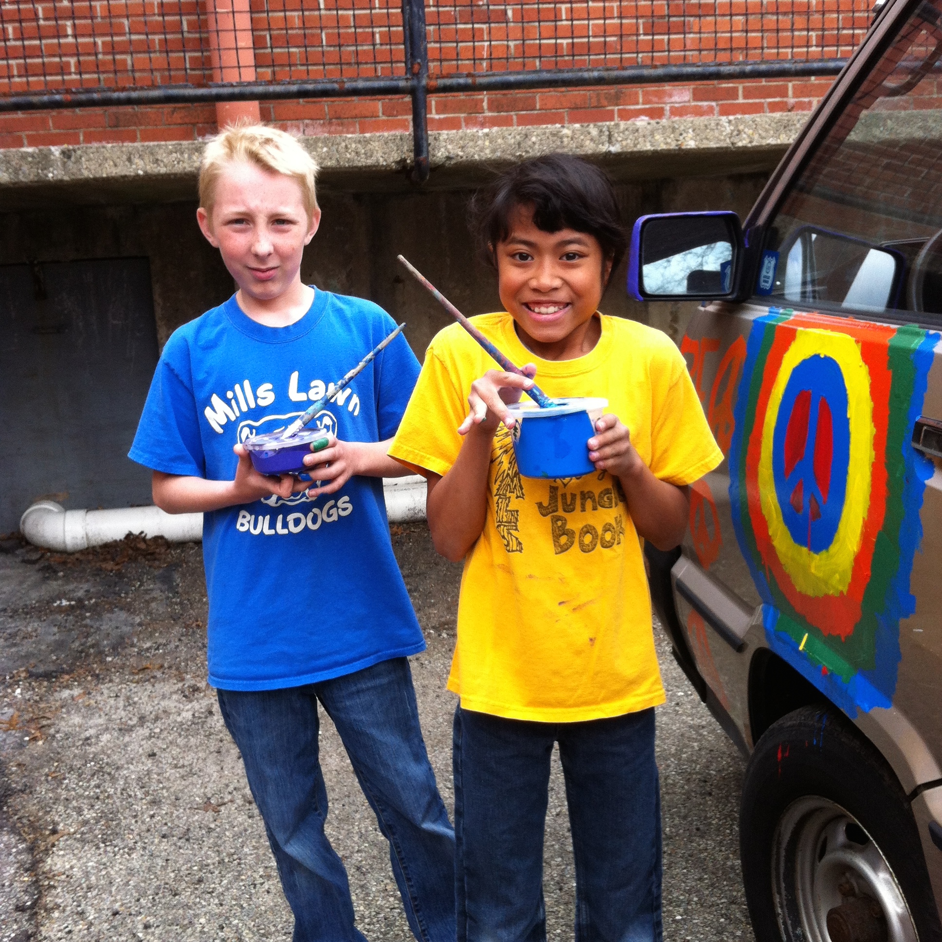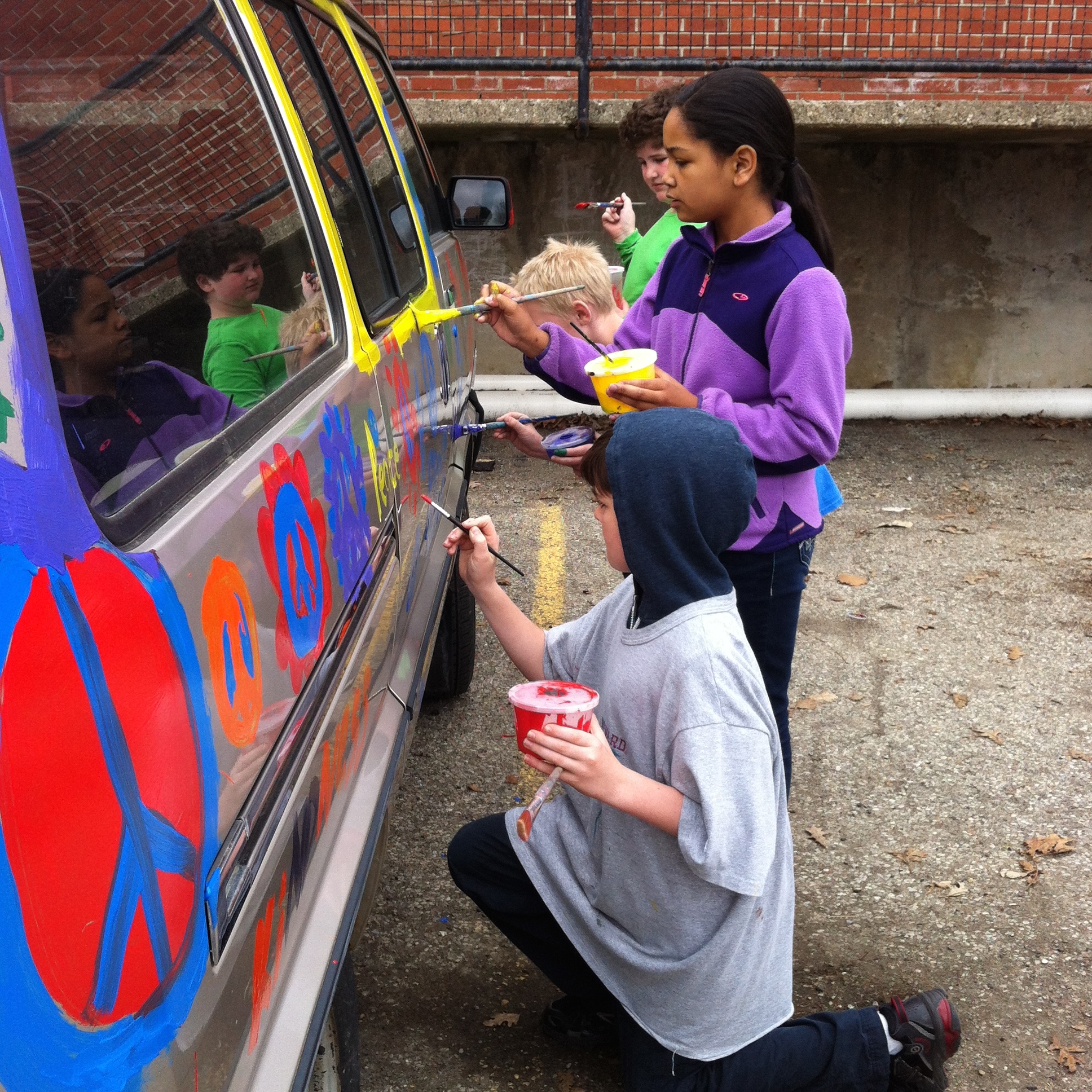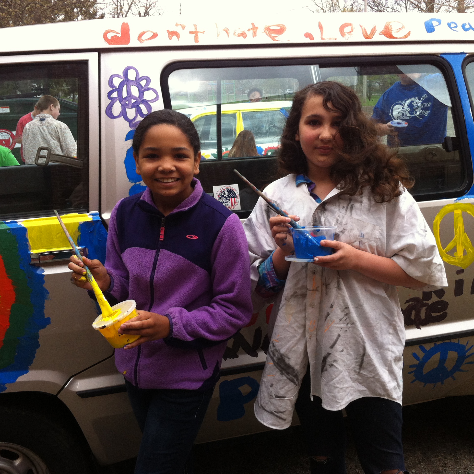 During Art with Mrs. Minehart and Ms. Stevens, fifth grade students have been painting a peace car and van. Inspired by the Kindness Bus that recently visited Yellow Springs, students are painting rainbow colors, peace signs, and messages of peace on a van donated by Karla Horvath and a car donated by Joe Ayers. The station wagon that Joe Ayers owns has over 350,000 miles and was previously owned by a parent at Mills Lawn who volunteered her car at least ten years ago starting the tradition of upper grade students painting the car each spring. The paintings have ranged from Keith Haring inspired artwork to rainbows and this year’s theme of peace. A big thank you to Karla and Joe for donating the cars as an exciting mobile canvas!
