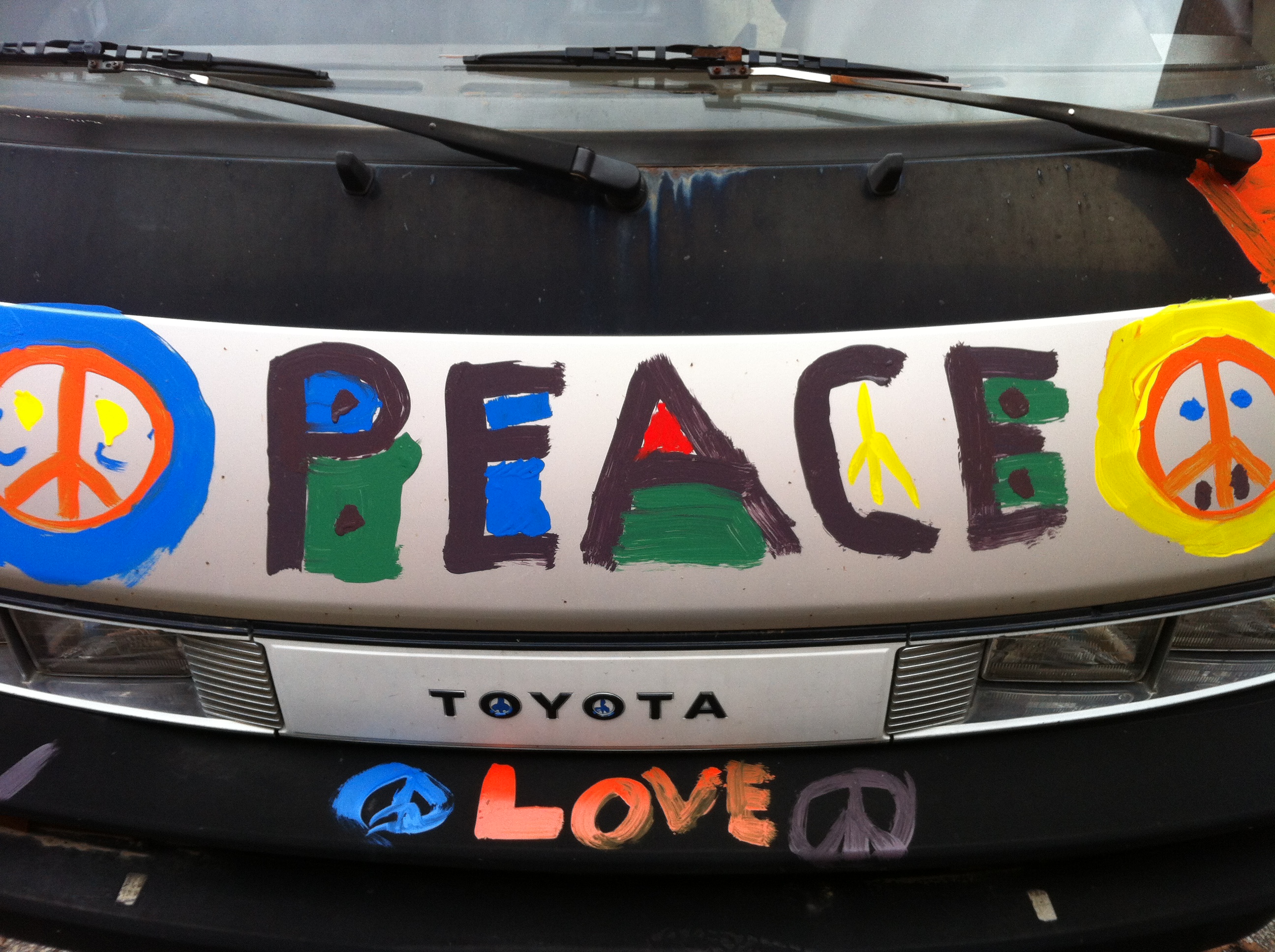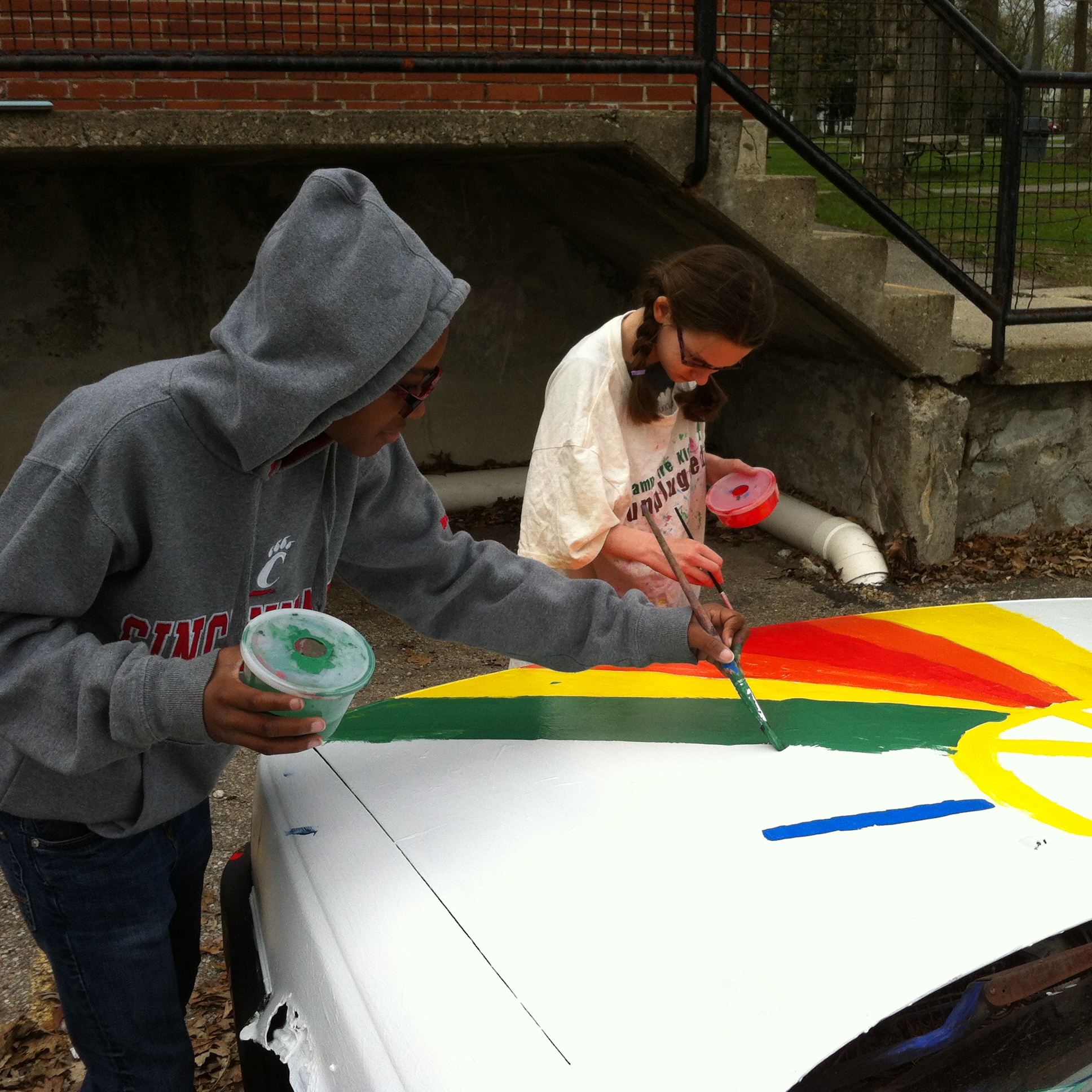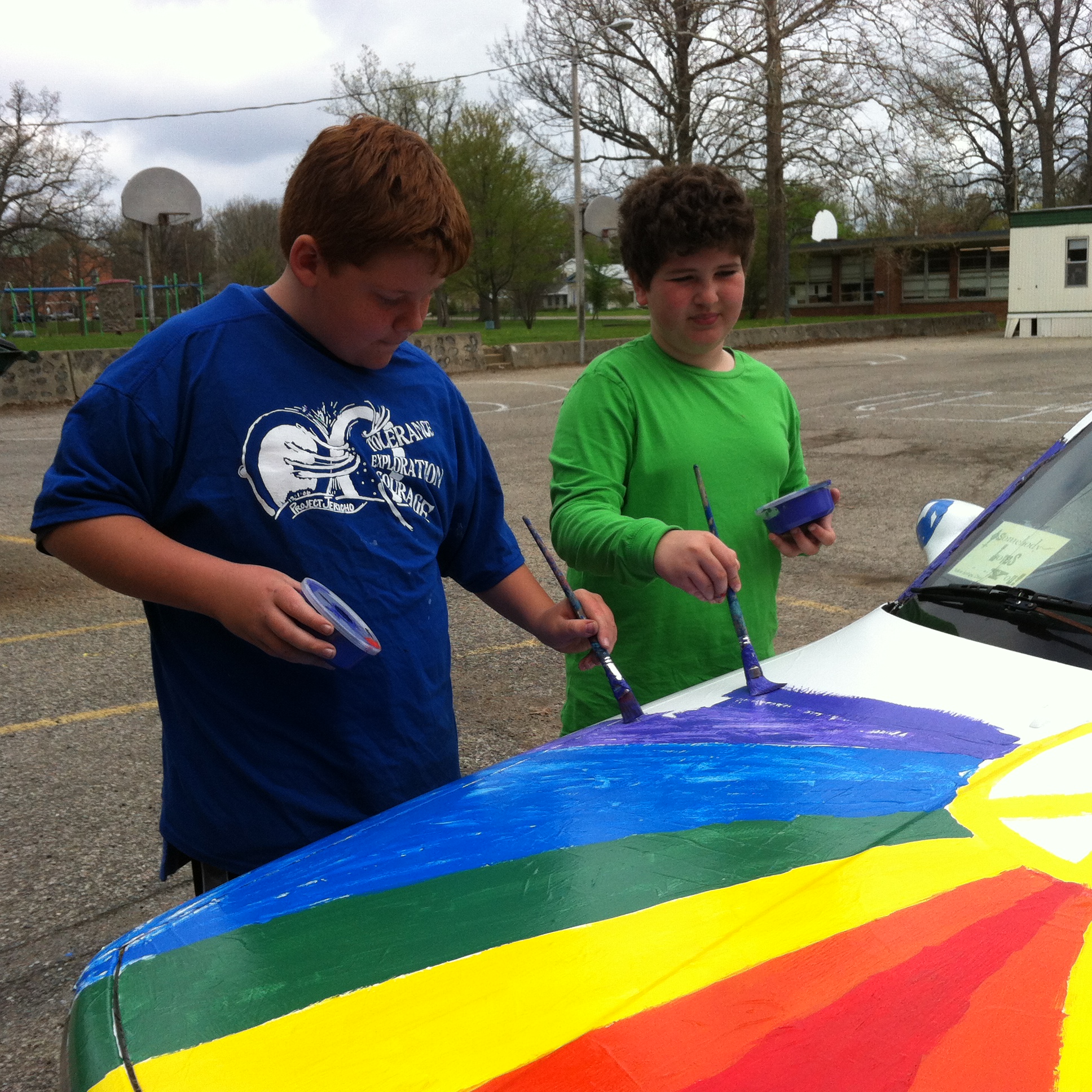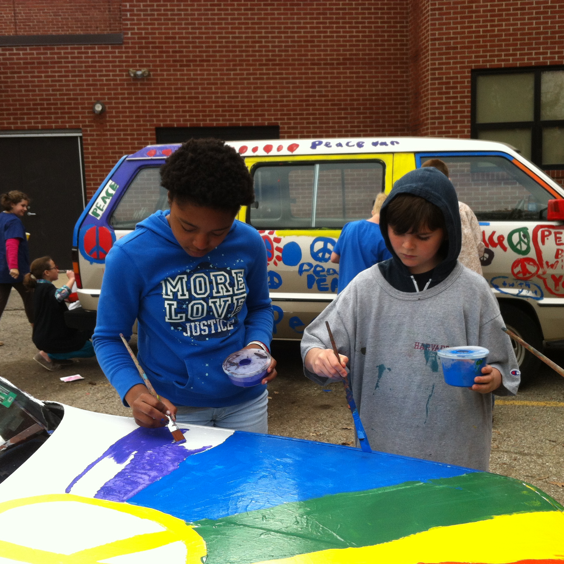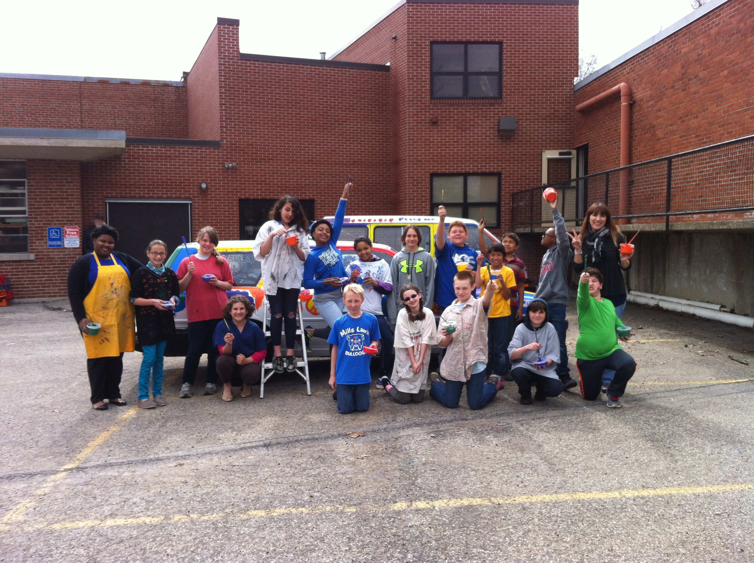 During Art with Mrs. Minehart and Ms. Stevens, fifth grade students have been painting a peace car and van. Inspired by the Kindness Bus that recently visited Yellow Springs, students are painting rainbow colors, peace signs, and messages of peace on a van donated by Karla Horvath and a car donated by Joe Ayers. The station wagon that Joe Ayers owns has over 350,000 miles and was previously owned by a parent at Mills Lawn who volunteered her car at least ten years ago starting the tradition of upper grade students painting the car each spring. The paintings have ranged from Keith Haring inspired artwork to rainbows and this year’s theme of peace. A big thank you to Karla and Joe for donating the cars as an exciting mobile canvas!