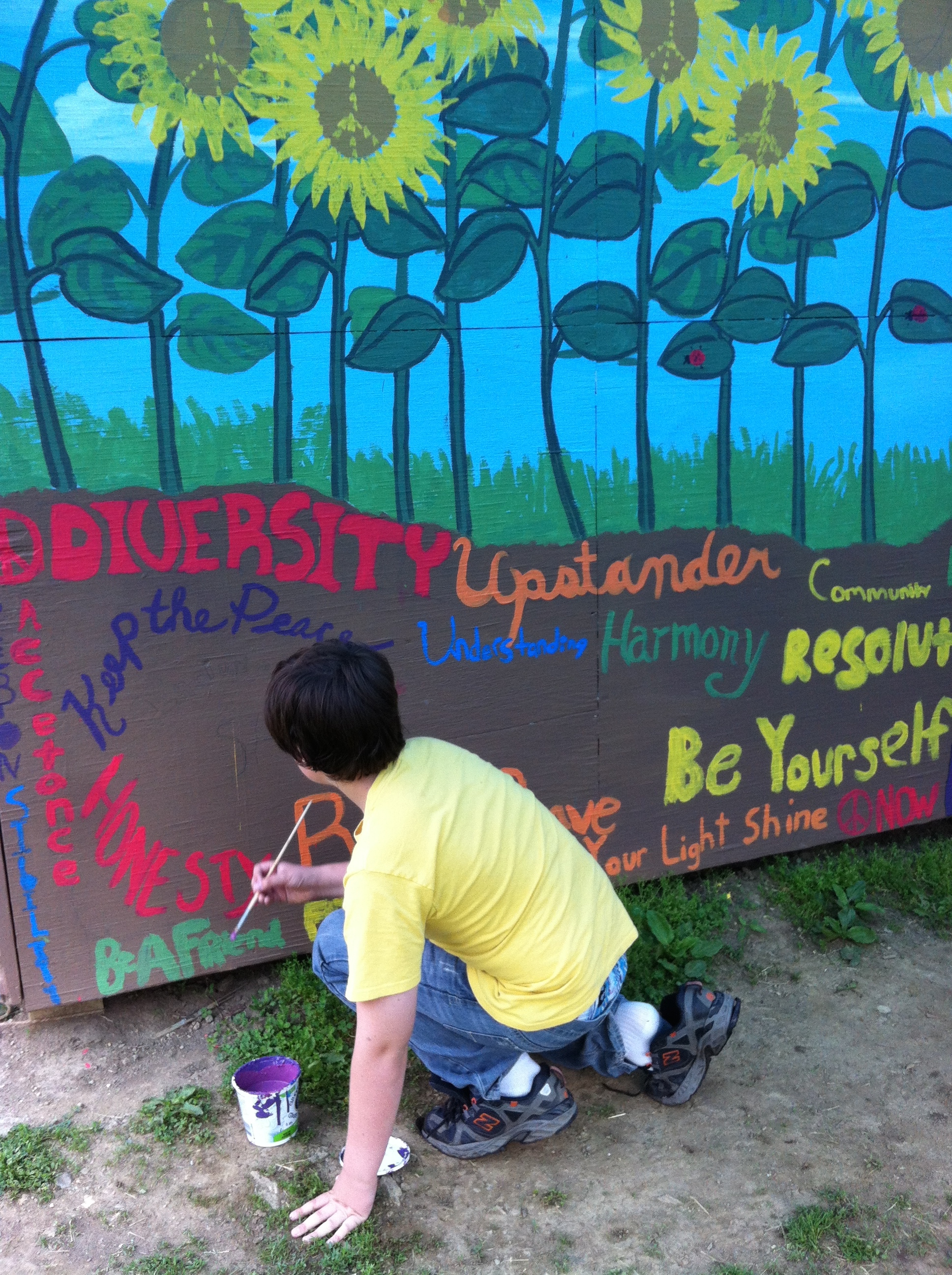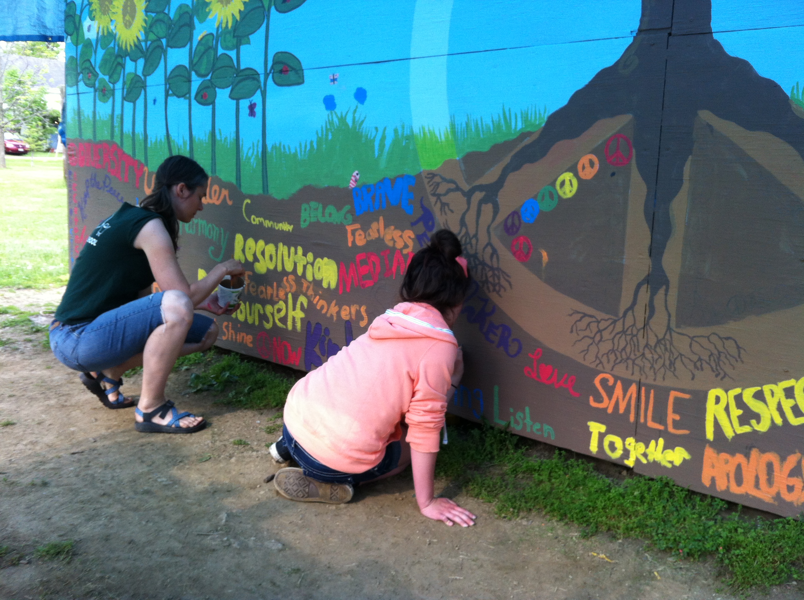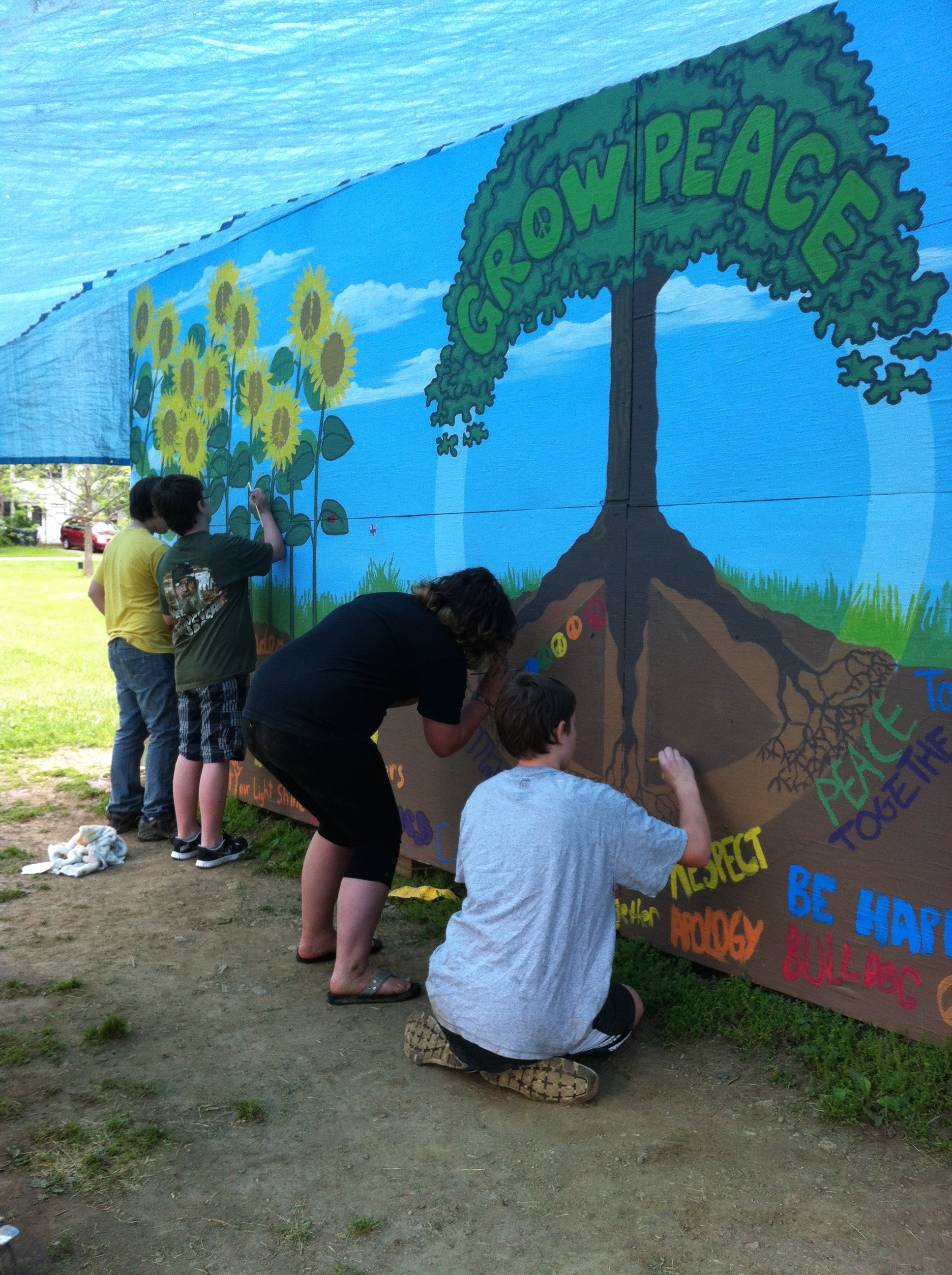 The Grow Peace Mural continues to… grow with words of peace! Check out the sixth graders’ progress on the mural, facilitated by Visiting Artist Tricia Tallman, at an unveiling this Friday evening during Exhibition Night, 6:30-8:00pm.
